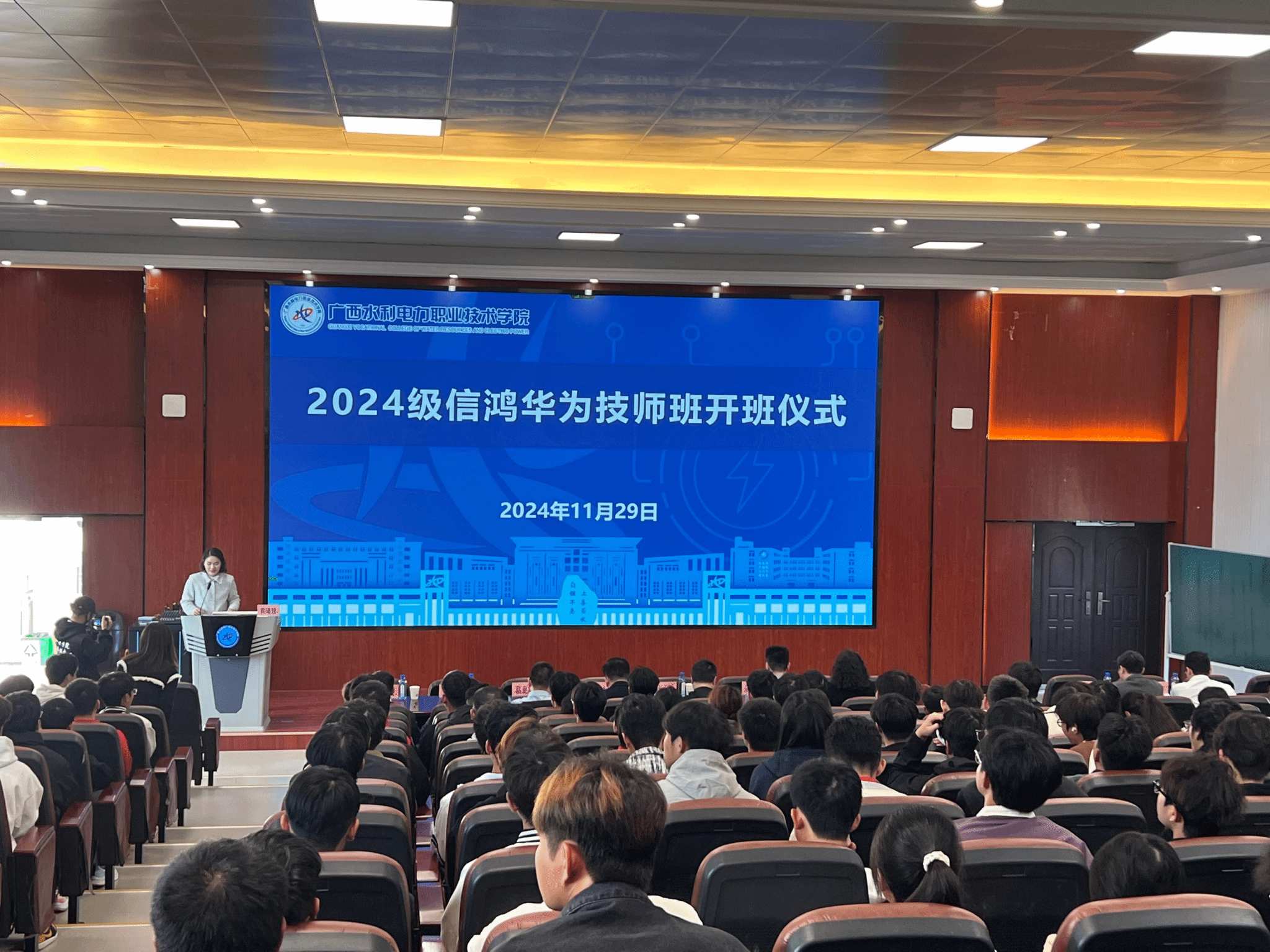 [本网讯]11月29日,学校在里建校区教学楼学术报告厅举行2024年信鸿华为技师班开班仪式。学校校长李林、东莞市信鸿人力资源管理有限公司总经理葛更辉、华为机器有限公司制造人力资源部高级经理张涛莅临现场,本次活动由招生与就业处副处长黄曦慧主持。
