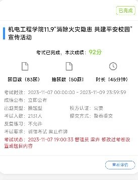 [本网讯]2023年11月9日是第32个全国消防日,为增强全民消防安全意识,广泛宣传消防安全知识,推动国家消防宣传教育工作深入开展,增强全体同学的消防安全意识,机电工程学院于2023年11月3日至11月13日通过易班平台开展国家消防教育宣传日答题活动,本次活动共计有2131人参与。