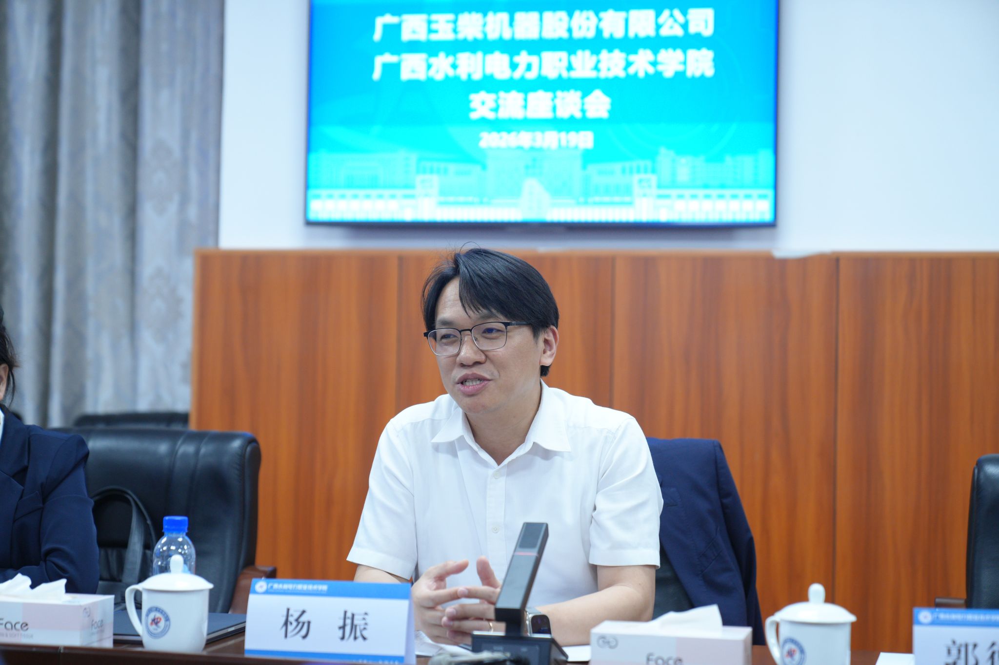 杨振对学校的热情接待表示衷心感谢,高度肯定了学校实训设施的硬实力与学科专业的软实力。他重点介绍了玉柴在传统动力、新能源、智能装备等领域的发展布局与建设成效,并结合企业发展需求,提出了双方后续在人才培养、技术创新、项目合作等方面的广阔空间与合作思路。