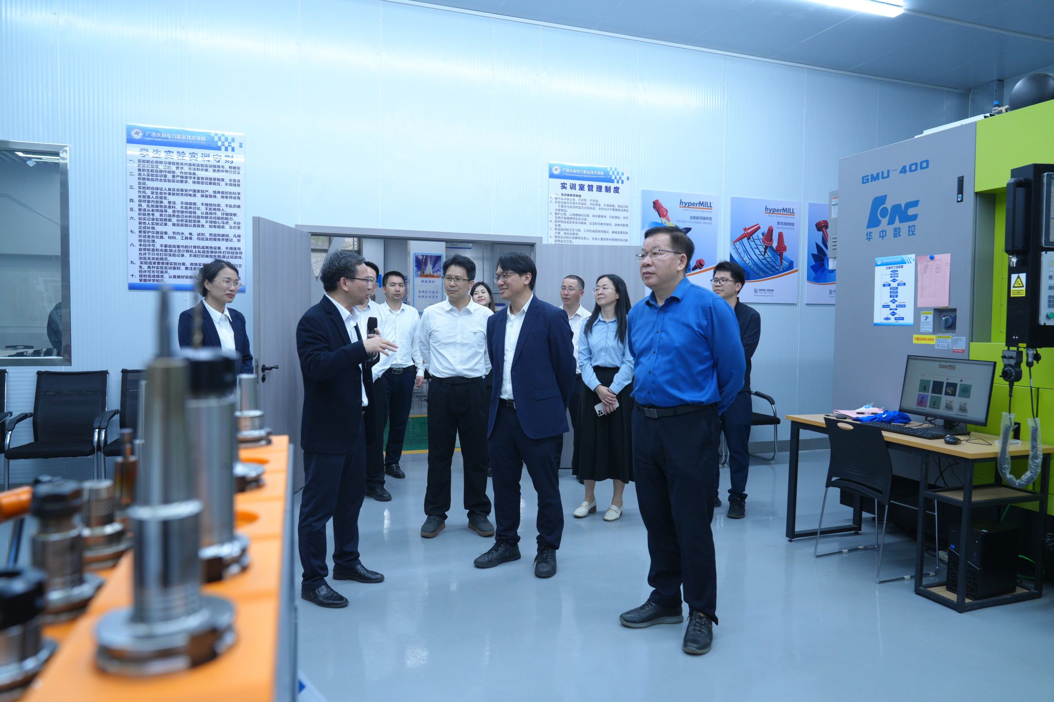 座谈会前,杨振一行实地考察了学校施耐德电气绿色低碳技术应用中心、桂水智造创新产品孵化基地、理想实训楼、安全教育馆、善水文化广场等多个具有代表性的实践教学与科研创新场所。