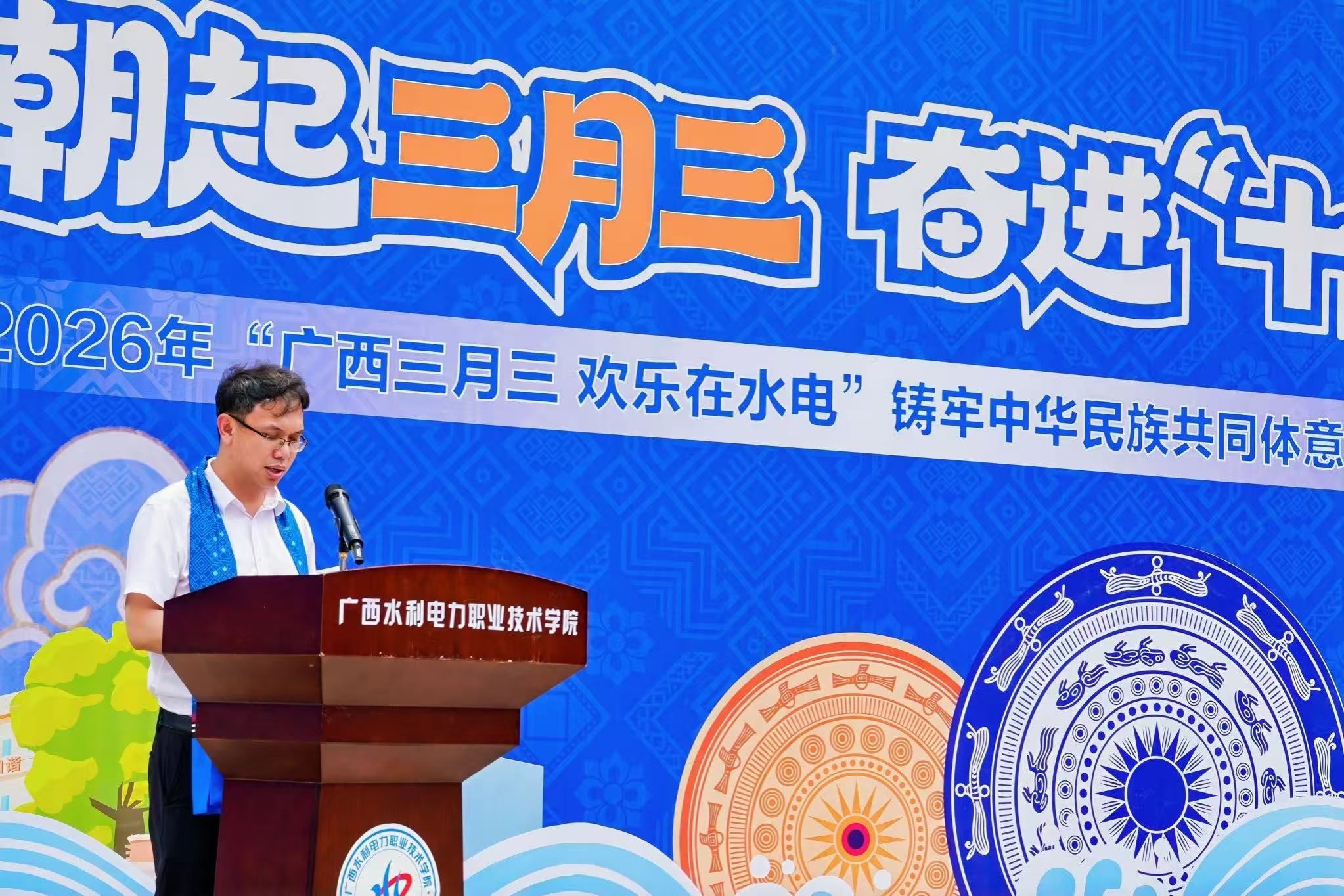 [本网讯]4月15日中午,庆祝建校70周年暨“潮起三月三·奋进‘十五五’”2026年“广西三月三 欢乐在水电”铸牢中华民族共同体意识宣传月启动仪式在两校区同步举行。党委书记李林、校长刘存香、副校长潘念萍、副校长黄海滨分别出席两校区活动。