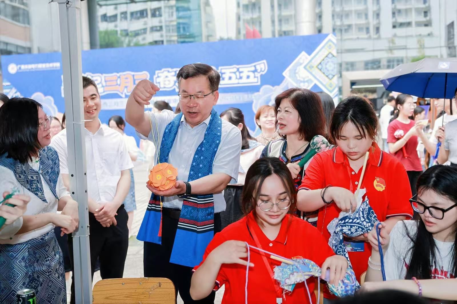 长堽校区在第四教学楼前运动场举办竹竿舞、抛绣球、美食分享等民俗游园活动。李林、潘念萍参与了抛绣球和跳竹竿舞活动,并与同学们亲切交流。李林勉励大家:“要像绣球一样紧紧凝聚在一起,在传承民族文化中铸牢中华民族共同体意识,做有家国情怀的时代新人。”现场掌声阵阵,两校区联动共庆佳节。