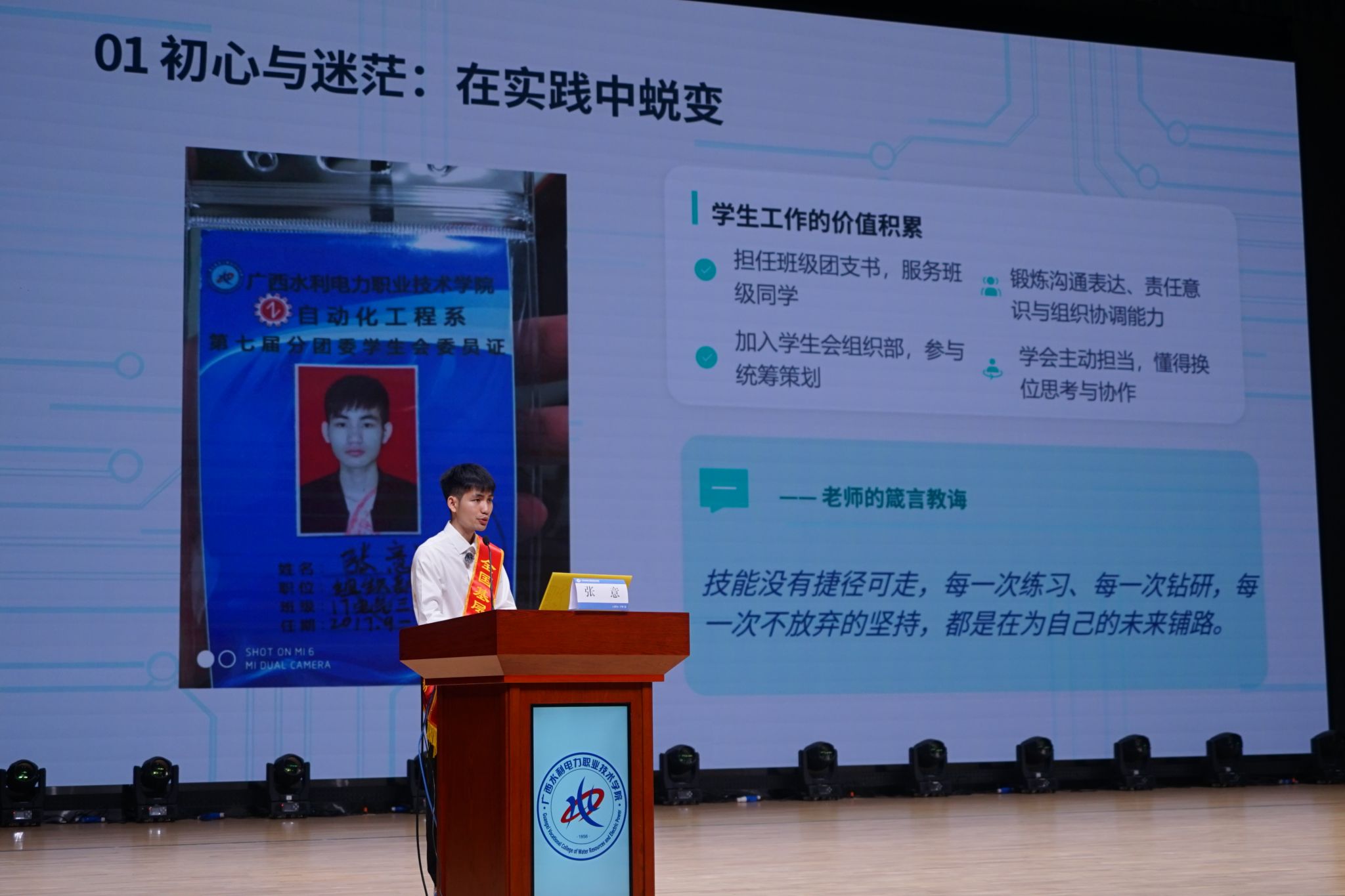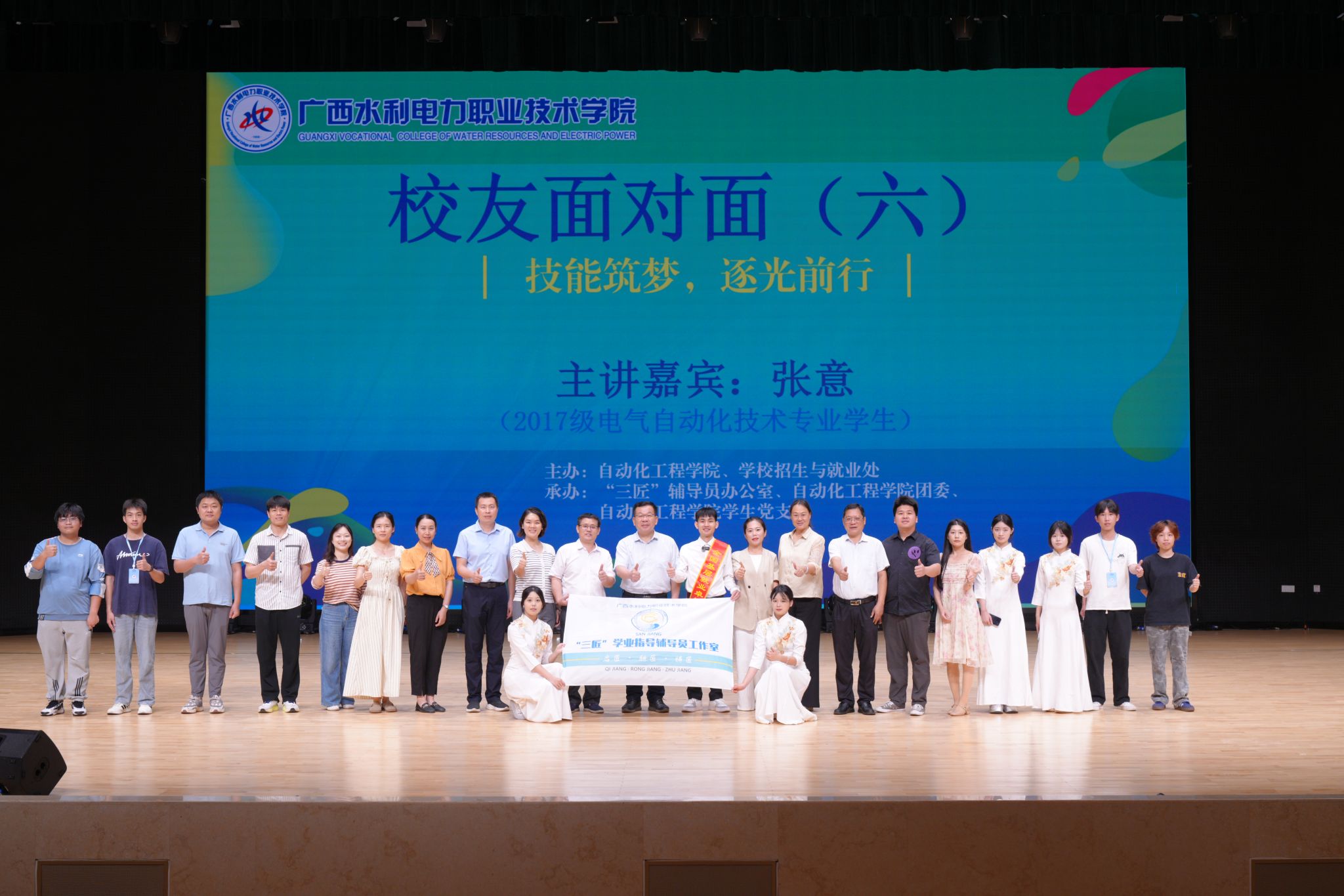 [本网讯]为深化“三匠”育人理念,助力学生技能成长与职业发展,4月22日晚,自动化工程学院联合学校招生与就业处、“三匠”学业指导辅导员工作室,在里建校区大学生活动中心举办“技能筑梦 逐光前行”校友面对面成长分享会,全国高校毕业生基层就业卓越奖学金获得者、全国交通技术能手、广西技术能手、自动化工程学院2017级电气自动化技术优秀毕业生张意作分享。学校党委书记李林出席活动现场并致辞。