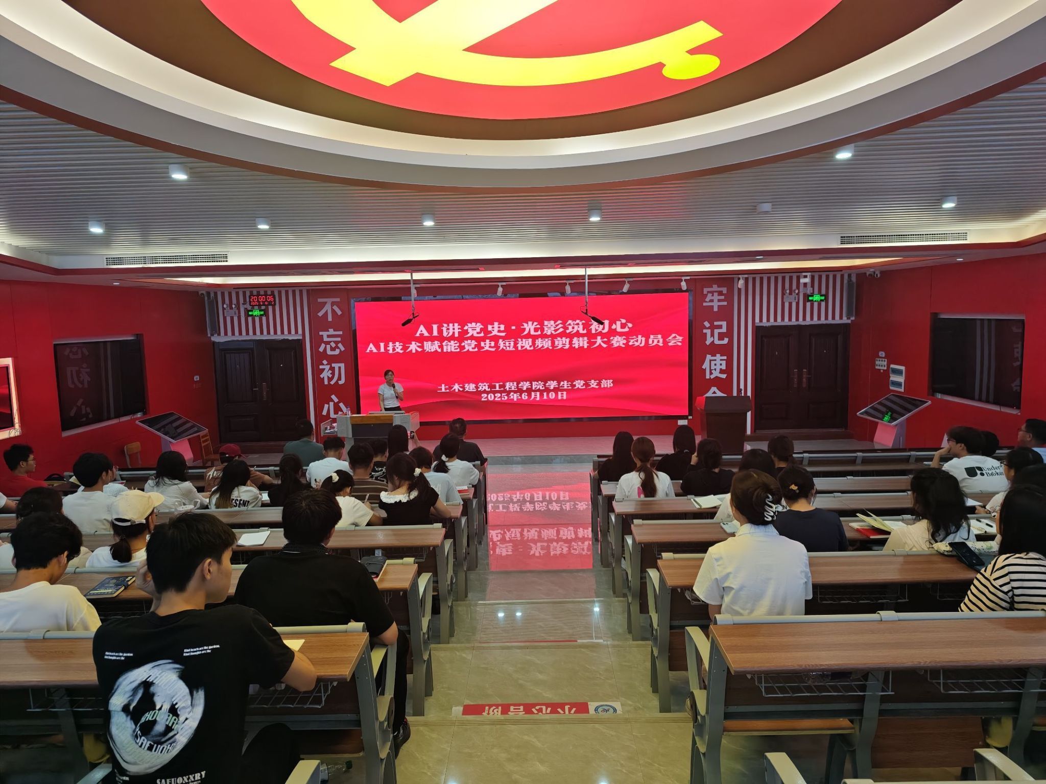 [本网讯]为深化党史学习教育,激发青年学子的创新实践能力,6月10日晚,土木建筑工程学院学生党支部携手大拇哥工作室、劳动育人工作室在教学楼红色文化馆举办“AI讲党史・光影筑初心”——AI技术赋能党史短视频创作大赛动员会。学院党总支书记梁中超出席并做动员讲话。动员会由支部书记许月美主持,23级和24级全体入党积极分子参与活动。