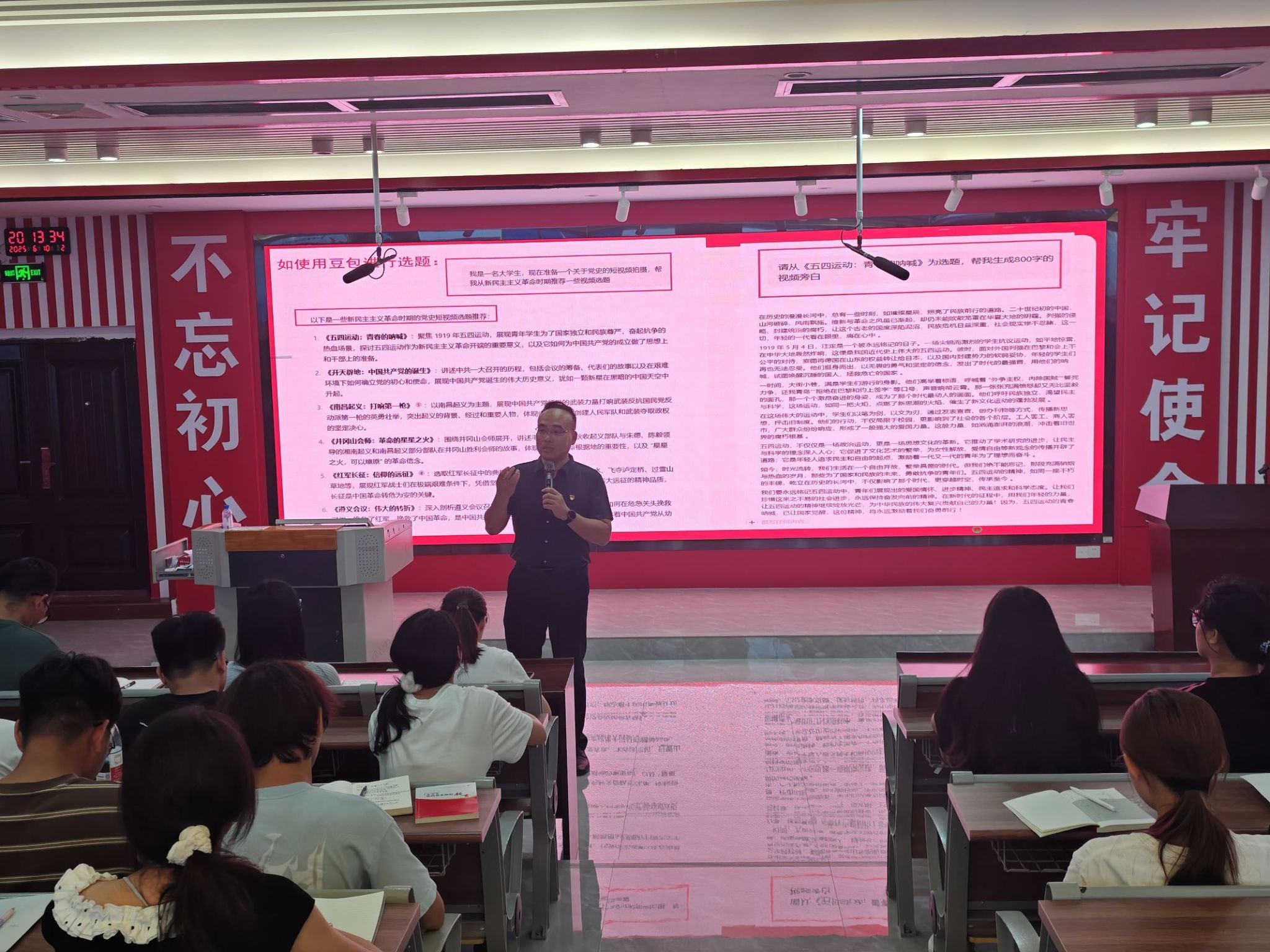 最后,梁中超对本次比赛进行赛前动员,他表示,本次比赛的筹办旨在两点:其一,引导同学们在选题与文案撰写过程中,深入研习党史知识,实现对红色文化的系统性认知;其二,通过短视频创作实践,推动同学们掌握生成式人工智能软件的操作技巧与前沿技术应用,在数字创作中提升科技素养。